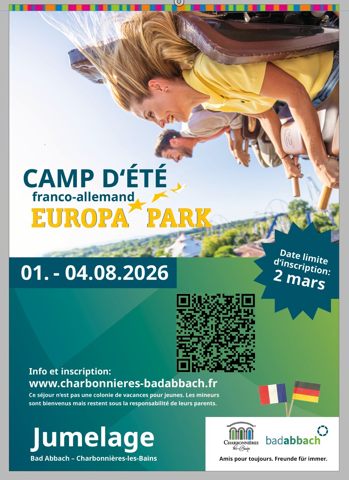 Envie de vivre un moment fort en aventures, rencontres et bonne humeur avec nos amis allemands ? Rejoignez‑nous du 1er au 4 août 2026 pour un camp d’été convivial à Europa‑Park (Rust, Allemagne) !